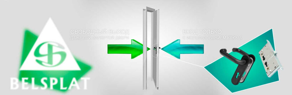 В качестве замка применяется врезной замок «Антипаника» и специальные ручки для противопожарных дверей. Все устройства системы «Антипаника» имеют одно предназначение — обеспечить легкое и быстрое открывание двери, без применения ключей в ситуациях, связанных с экстремальной эвакуацией, экстренным выходом. Как правило, любое устройство «Антипаника» способно открыть дверь немедленно всего лишь от одного нажатия рукой. При этом важным для таких устройств условием является легкое и мгновенное открывание двери изнутри помещения, но никак не снаружи. С внешней стороны дверь открывается, как и все двери, ключом.