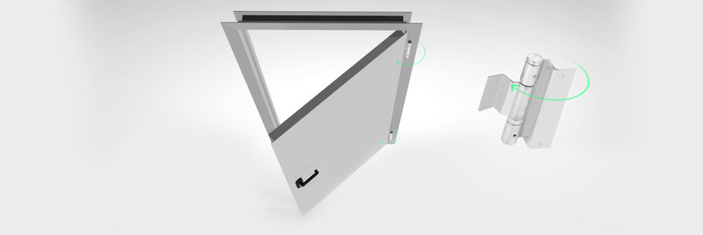 Полотно установлено на коробку при помощи противопожарных, самодоводящих стальных петель, что позволяет створке двери возвращаться в исходное, плотно затворенное, состояние без дополнительного вмешательства человека.