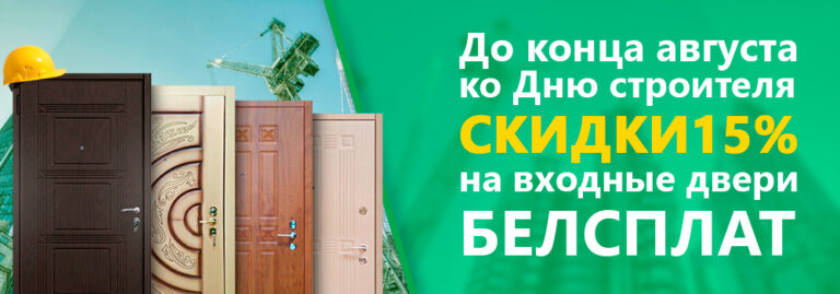 Двери «Белсплат» – прекрасное украшение для старого семейного дома и новой современной квартиры. А в августе к этим характеристикам прибавляется ещё одна – выгодная цена. Ведь по с 13 по 31-е августа действует скидка 15% на входные двери «Белсплат», приуроченная ко Дню строителя. Торопитесь к нам за выгодными покупками!